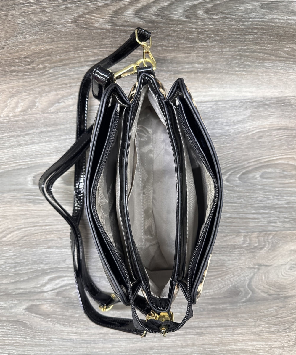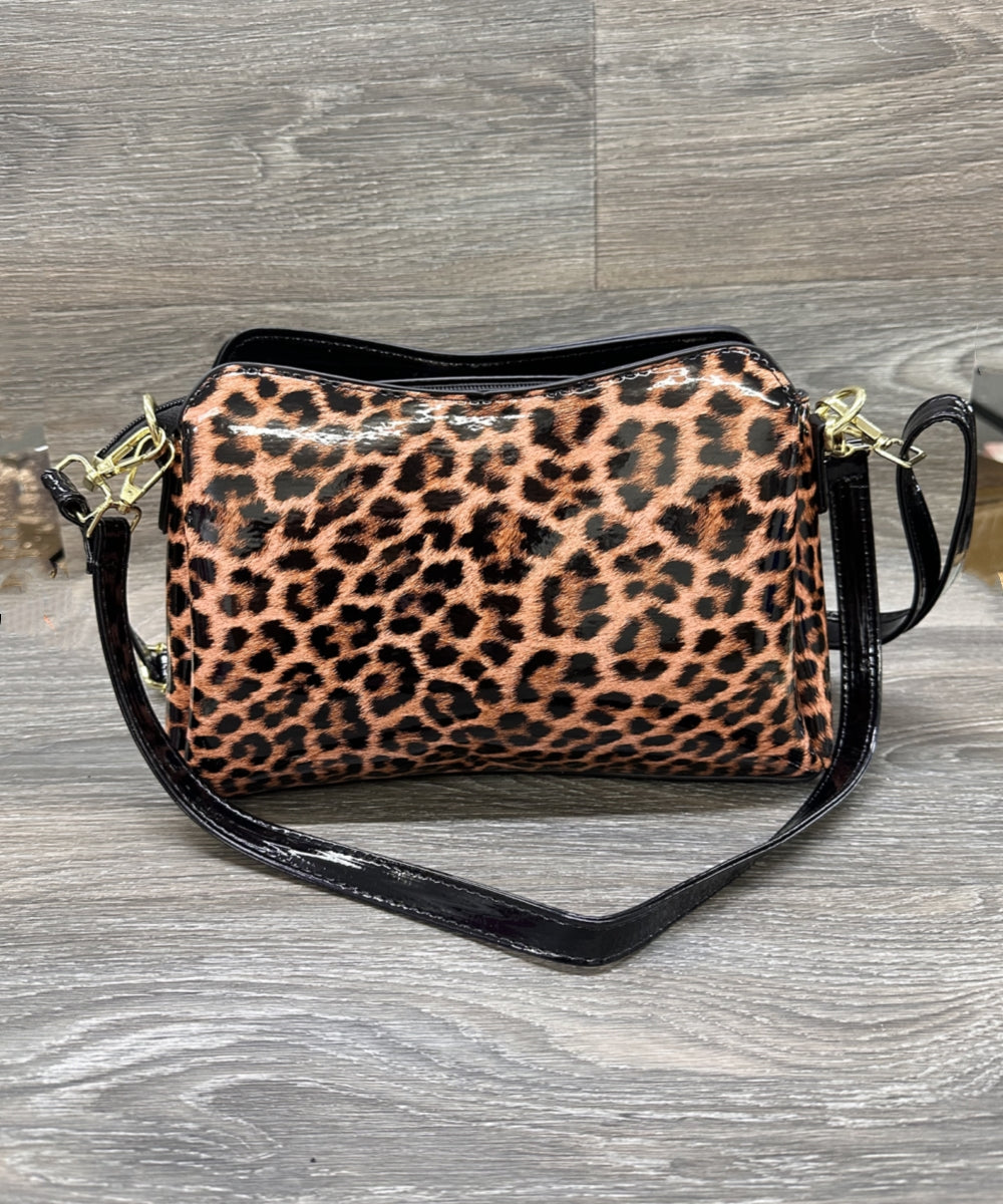 Featuring a stunning blend of leopard patent shine handbag with 2 handbag strips this structured satchel combines elegance with edge.Size: L 11" W 4" H 7.5"